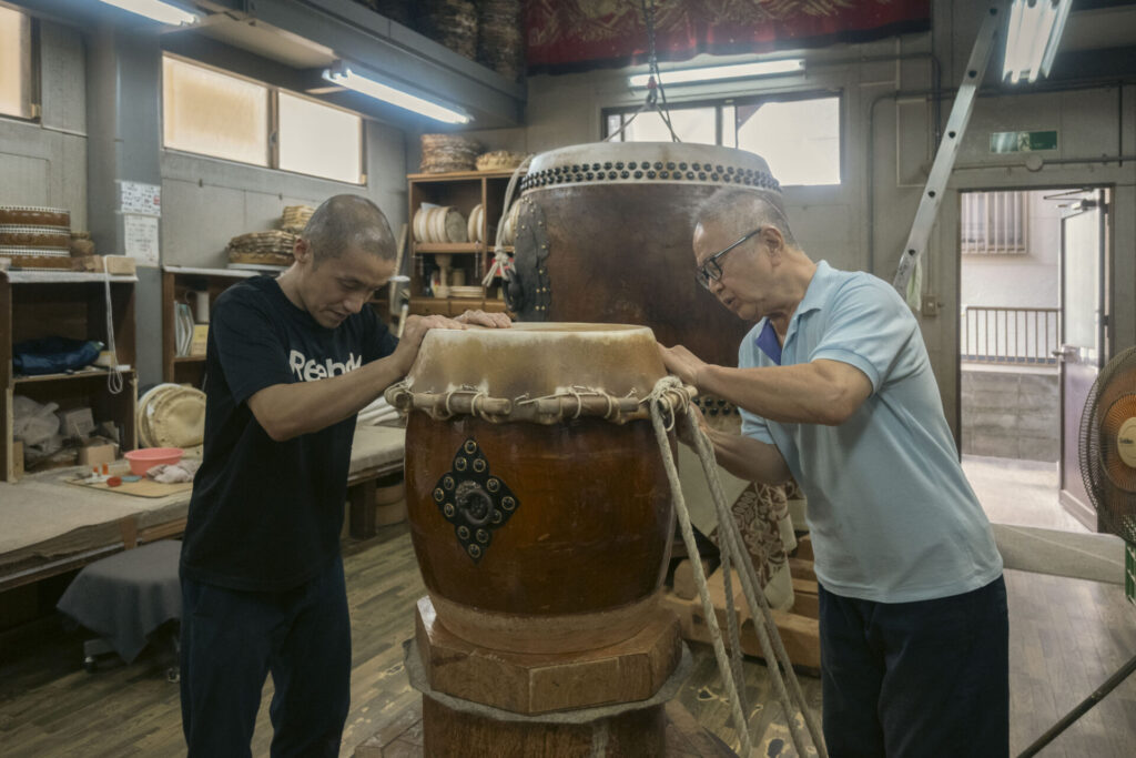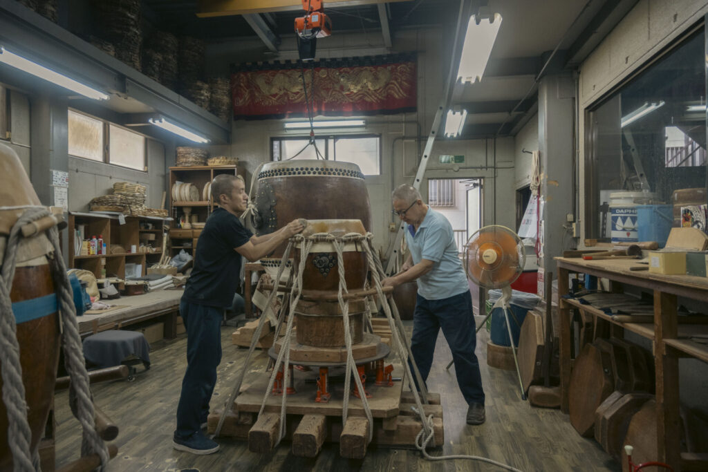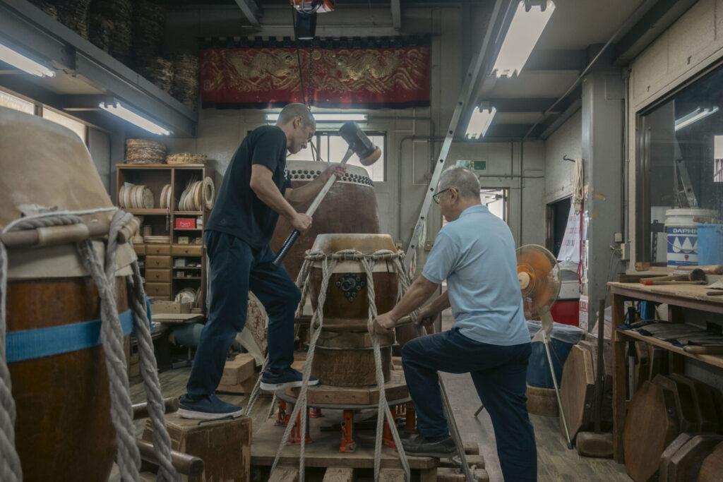 早速製作所に足を踏み入れると、そこはまるでリハーサル真っ最中のコンサートホールのように、緊張と高揚が入り混じり、太鼓の音が工房全体に震えながら響いていました。