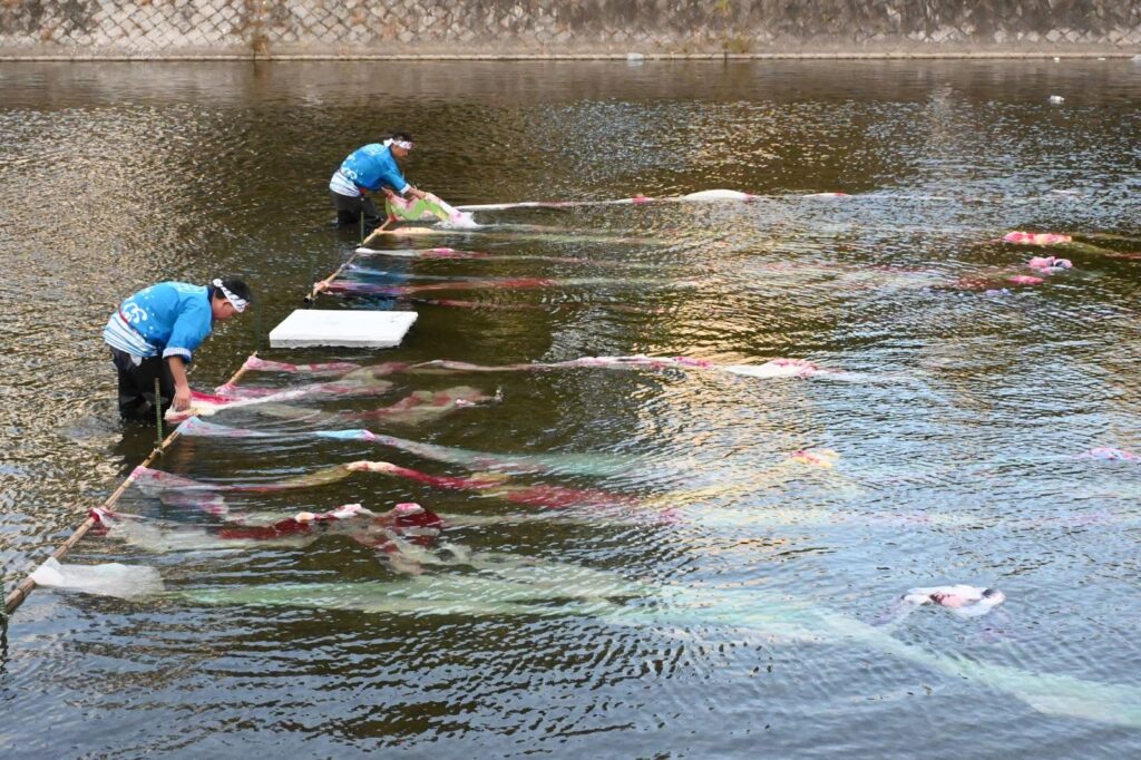 見どころは、生地をたぐって下流に向けて放り投げるところ。放り投げることによって、遠くまで生地がきれいに縦に流れて汚れが全体に落ちるのだといいます。イベント当日に取材した際も、「バシャッ、バシャ」と水音を立てて生地が空中に翻る瞬間には観客が歓声をあげていました。