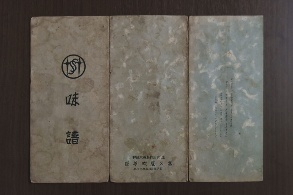 お店には当時の洋食のメニュー表と喫茶部のメニュー表がそれぞれ残っています。メニューの表記が「味譜」であったり「丸公」といった公正価格の意味を持つ言葉がメニュー表に記載されています。戦後すぐの時代では、ウィスキーや牛乳の値段を国が決定して、その価格で販売が行われていたそうです。戦後当時の状況や物流が伺える物がメニュー表という形で残っており、富久屋の歴史を感じさせます。